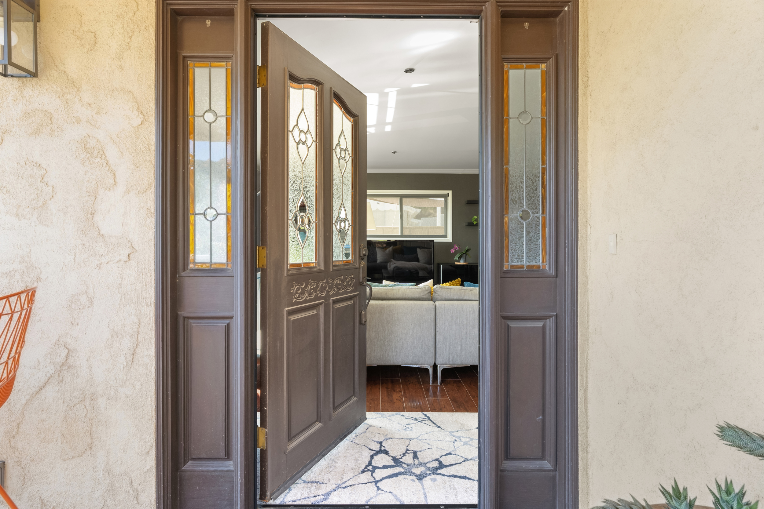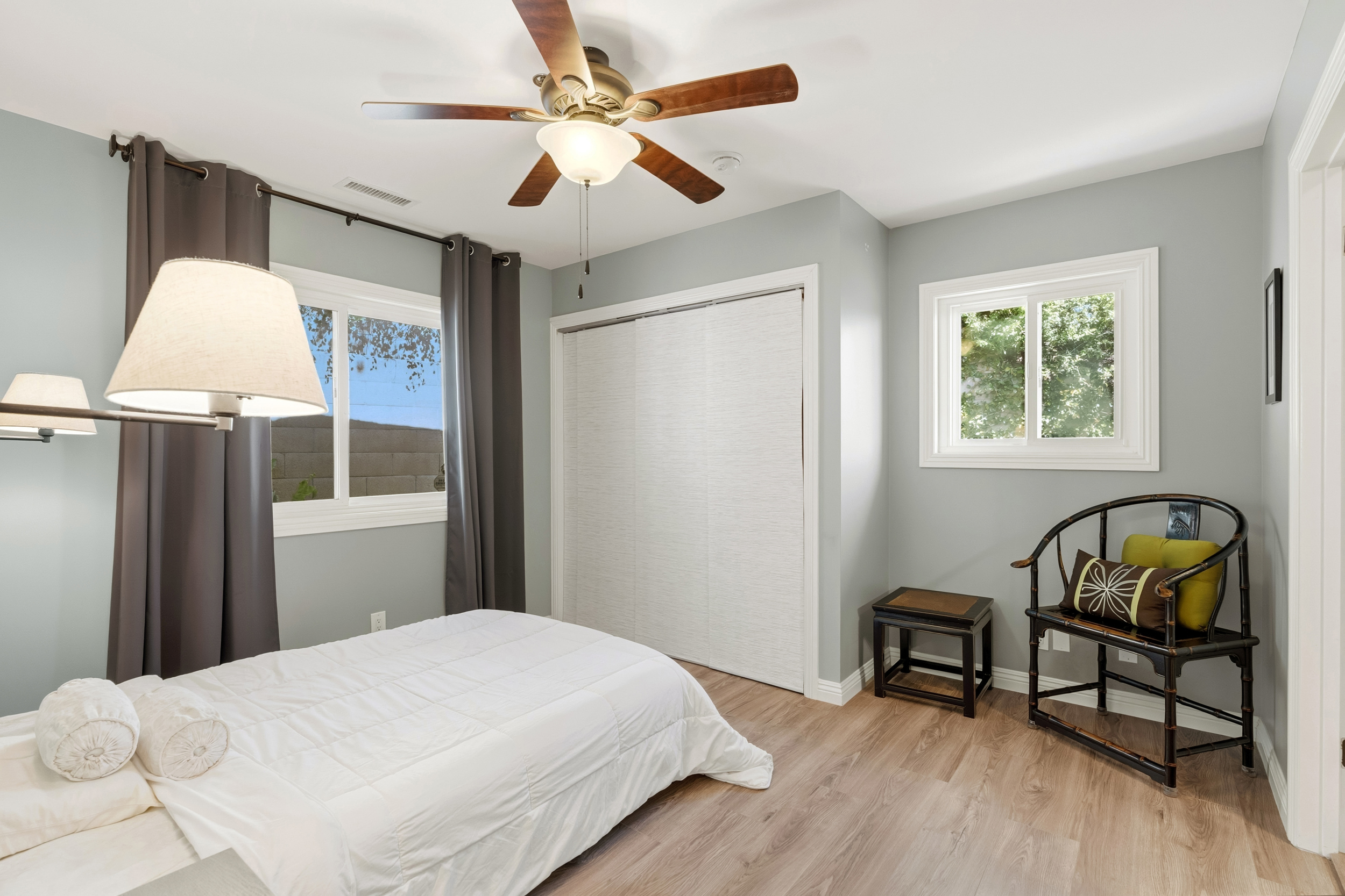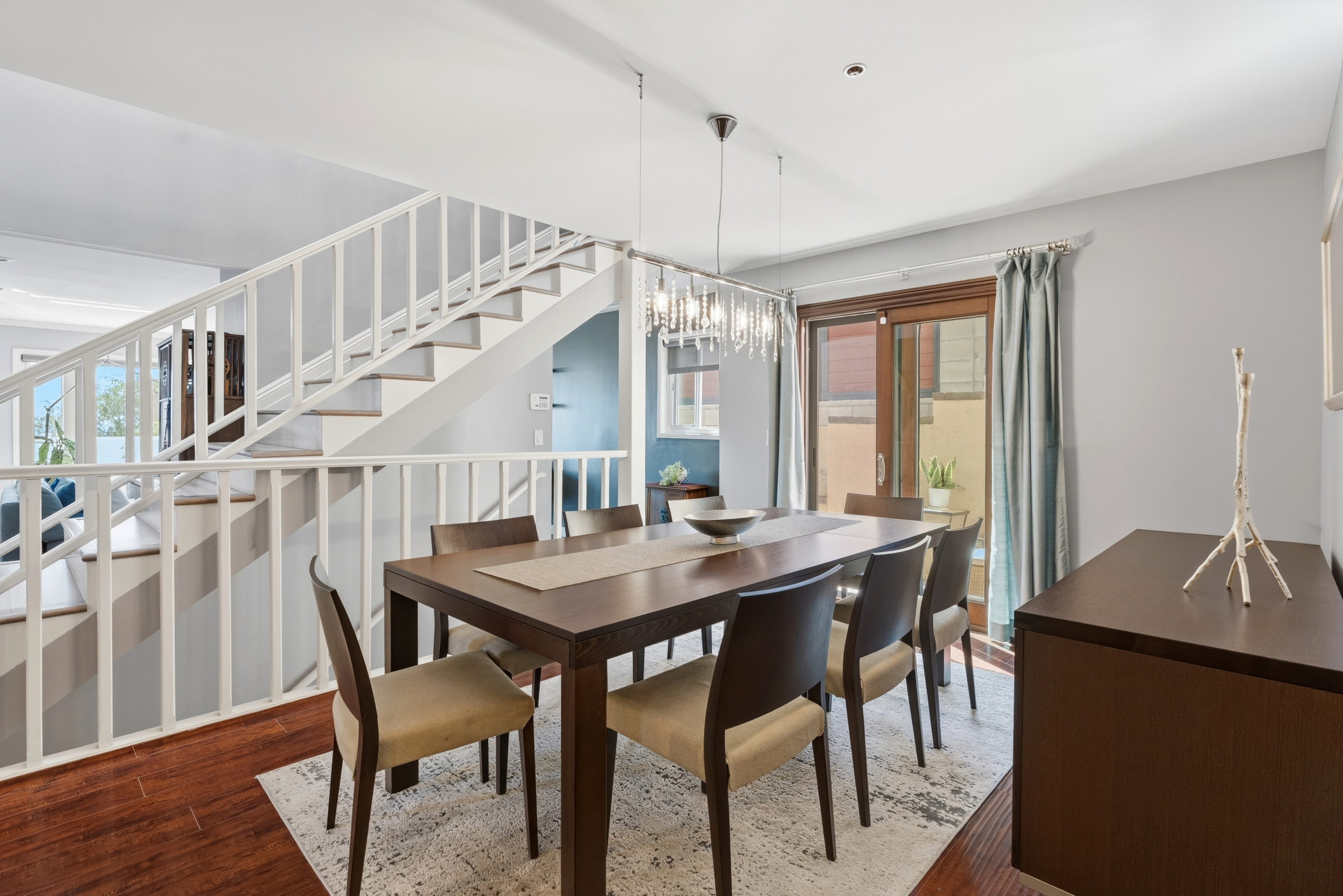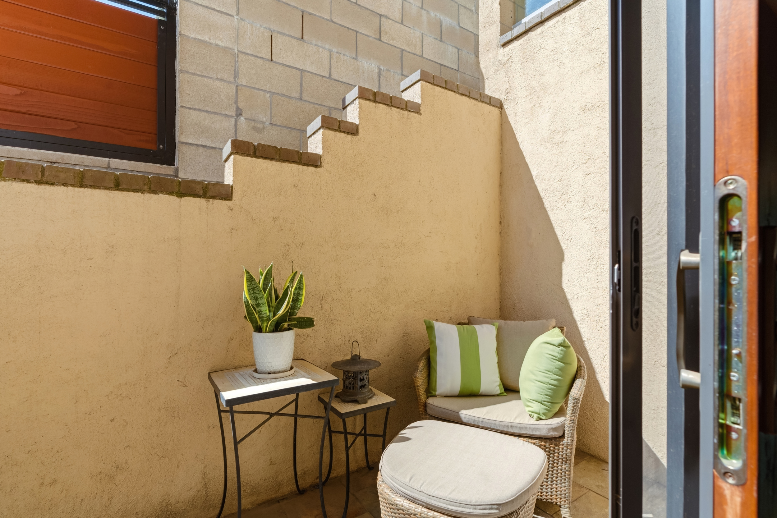 Upstairs, the conveniently located laundry room features a glass door that fills the space with natural light while providing direct access to the backyard. Outside, accent lighting around the patio and yard creates a warm and inviting ambiance.