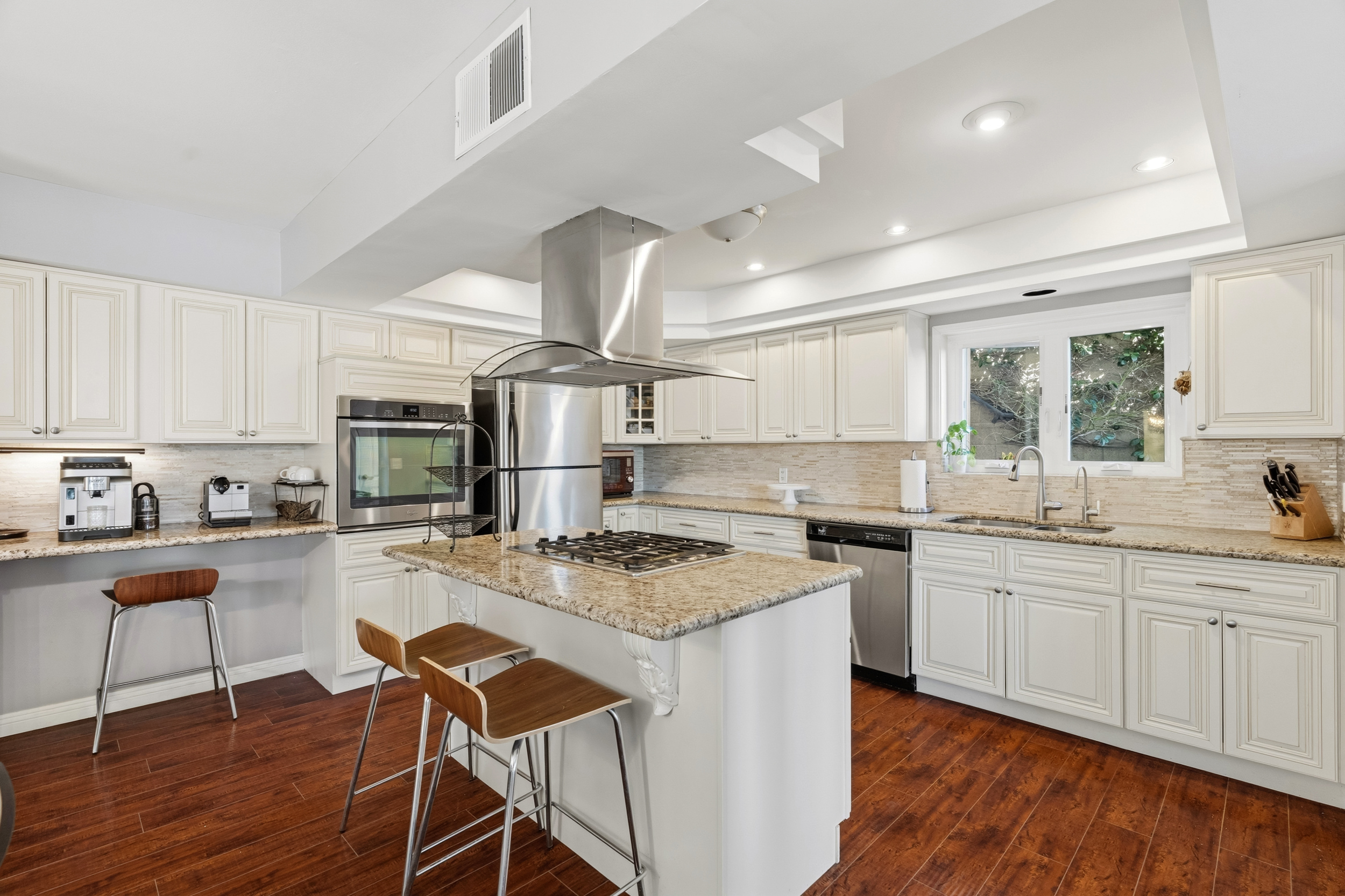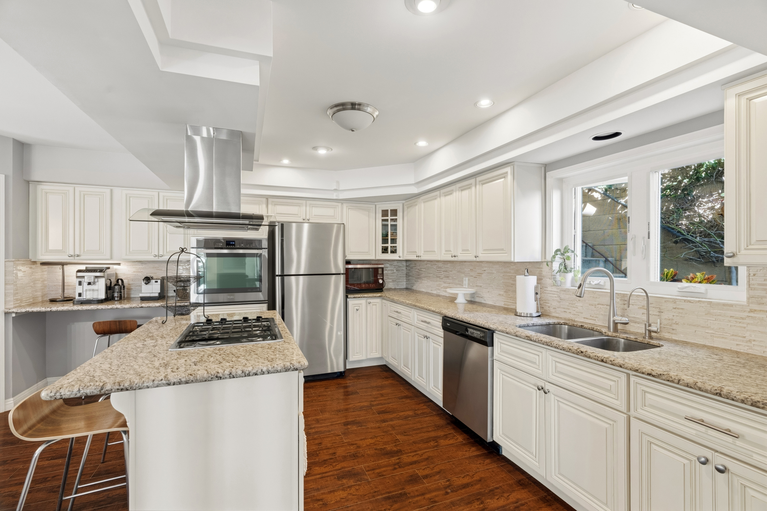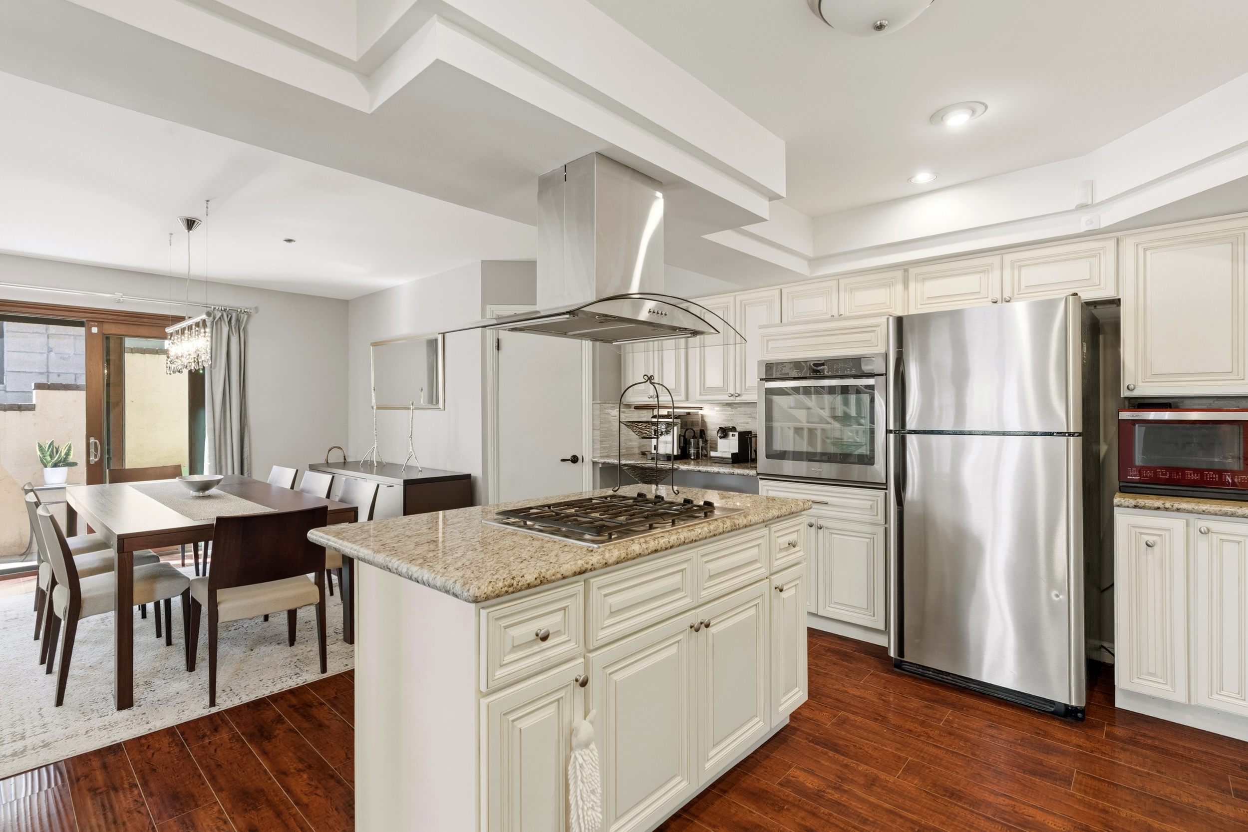 The spacious kitchen, updated in 2014, is designed for both everyday living & entertaining. It features a center island with gas cooktop, granite countertops, a coffee bar or workstation, walk-in pantry, breakfast counter, and an open flow to the dining room. The generous dining area opens through sliding doors to a charming side patio, perfect for outdoor grilling.