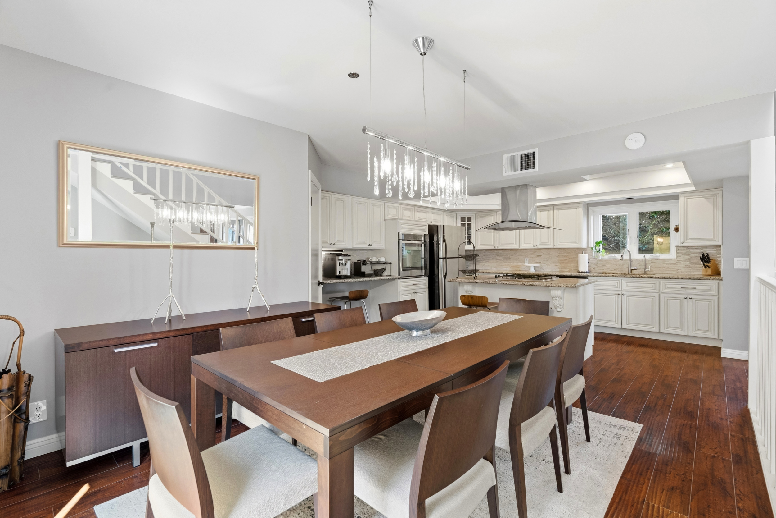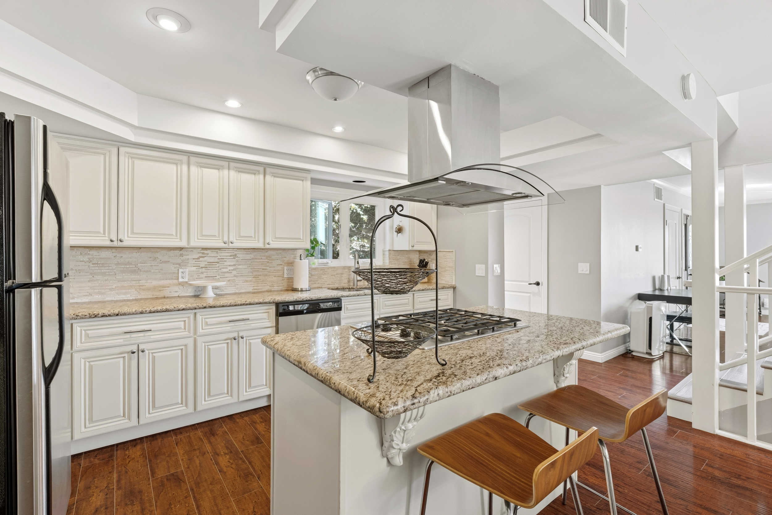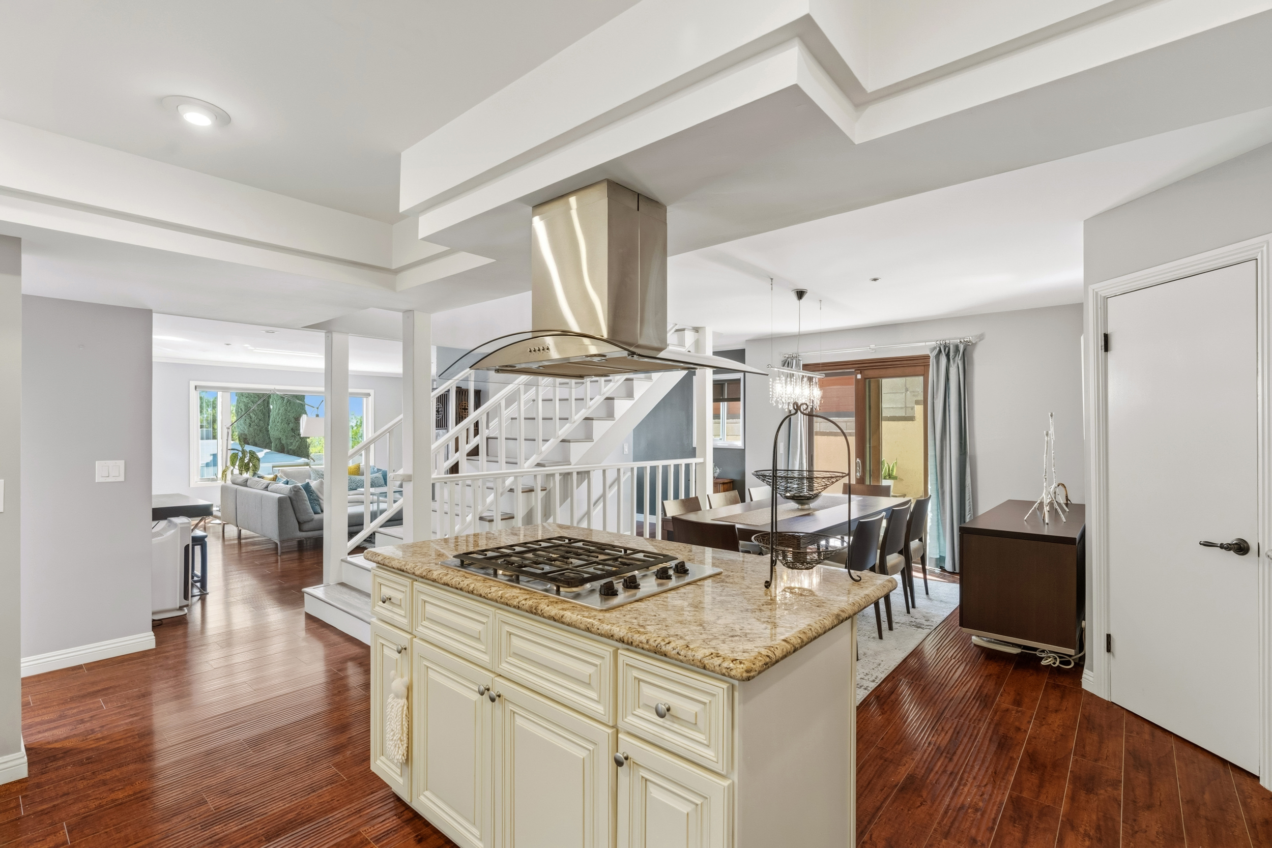 The spacious kitchen, updated in 2014, is designed for both everyday living & entertaining. It features a center island with gas cooktop, granite countertops, a coffee bar or workstation, walk-in pantry, breakfast counter, and an open flow to the dining room. The generous dining area opens through sliding doors to a charming side patio, perfect for outdoor grilling.