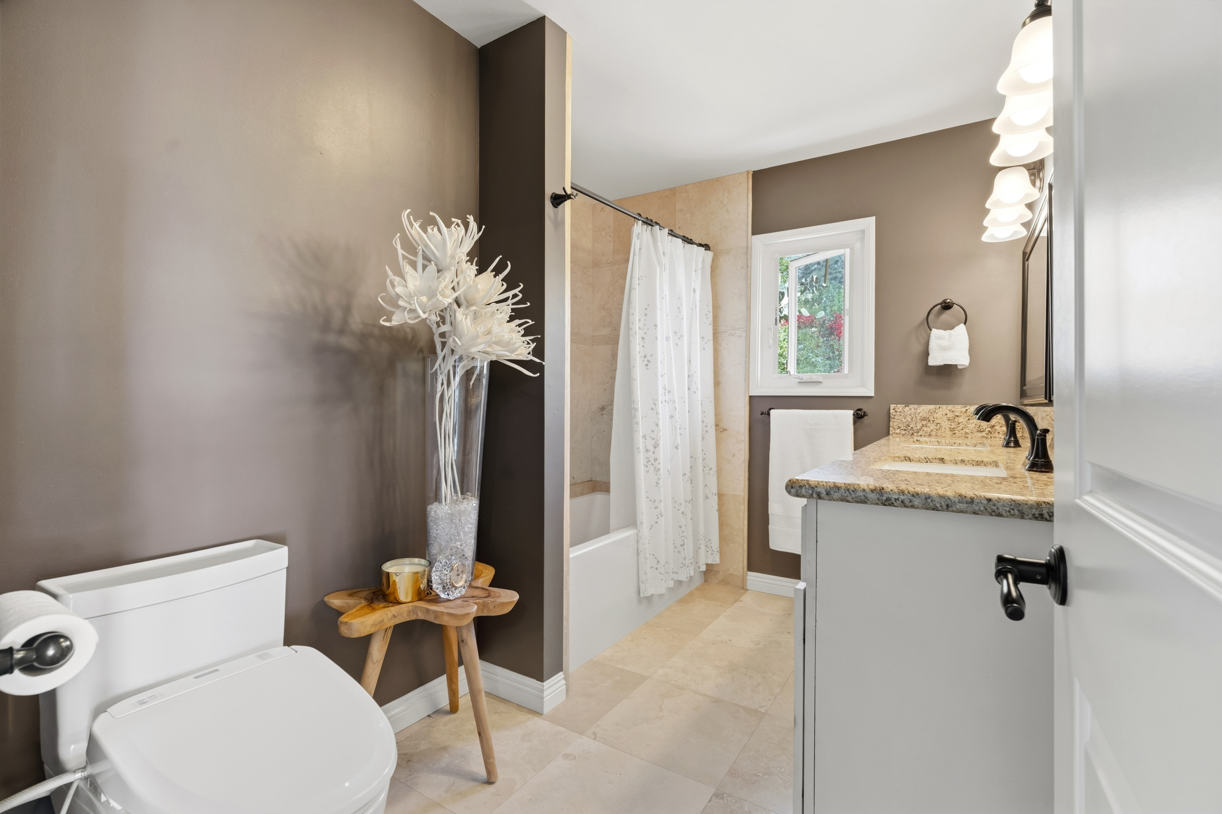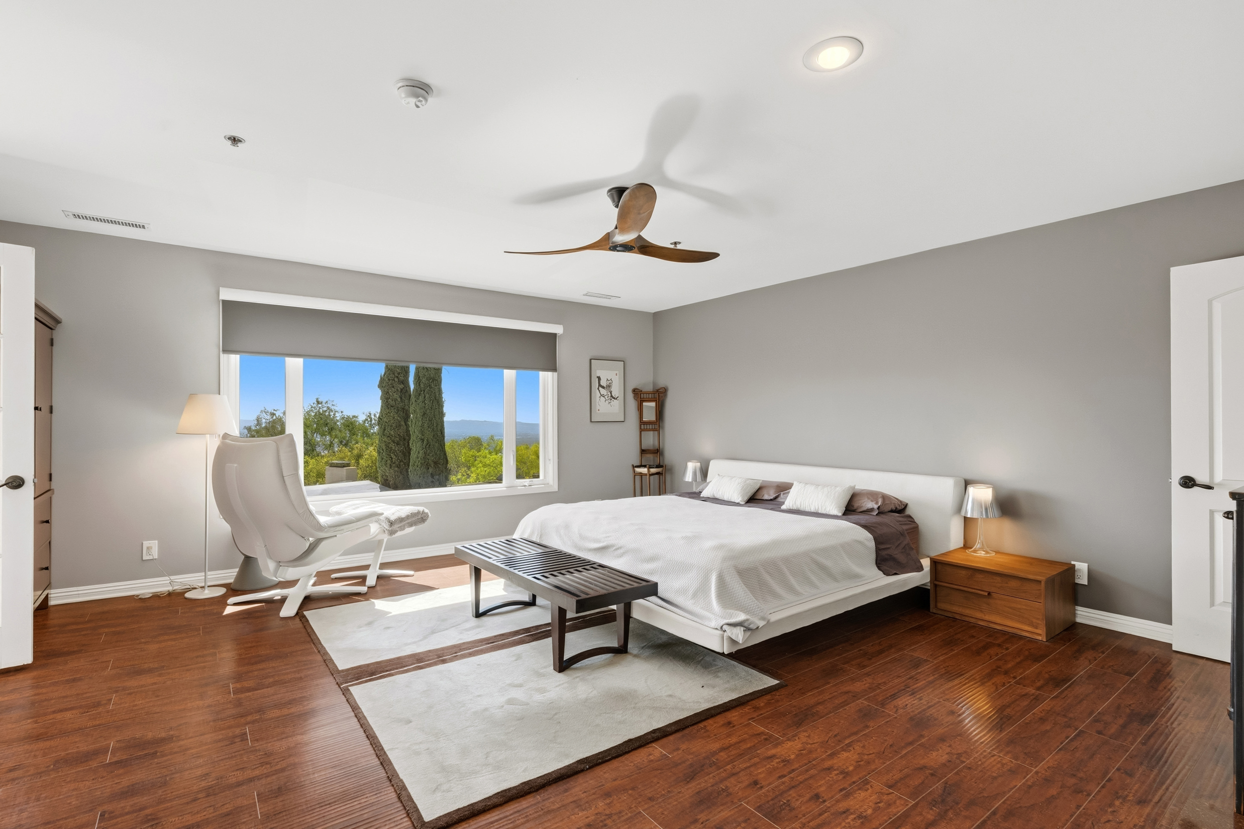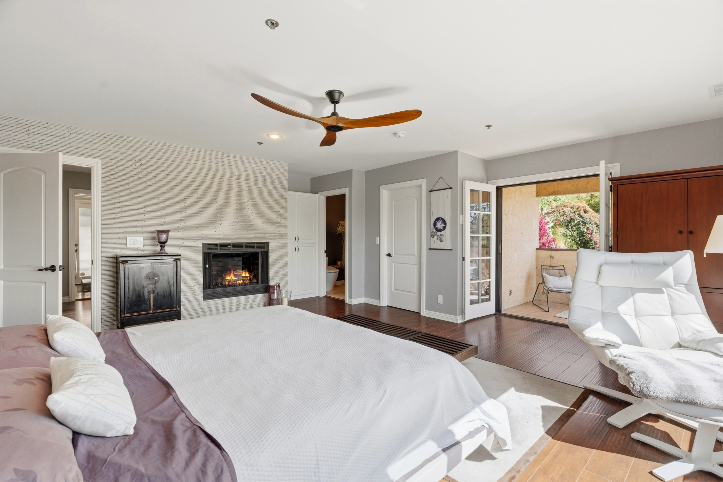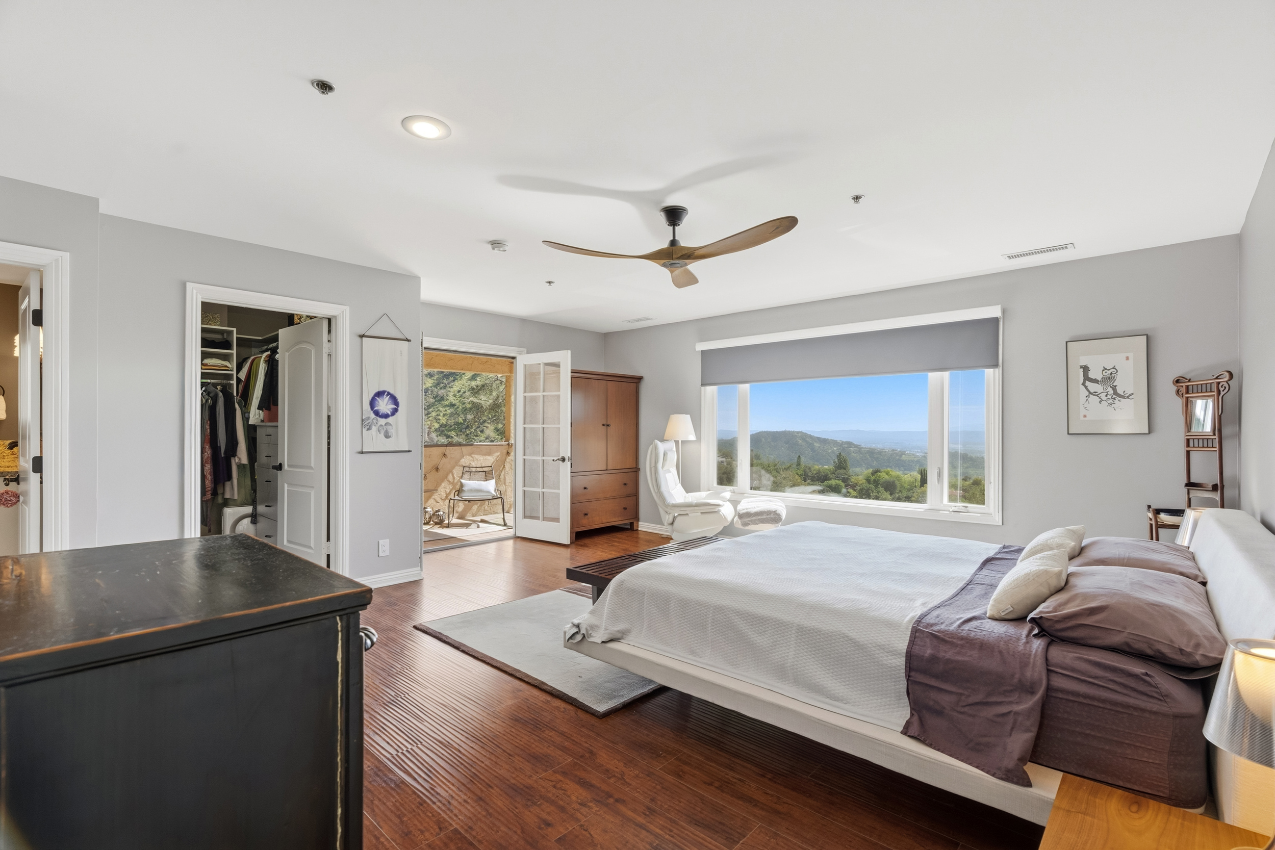 The generously sized primary suite is a true retreat, highlighted by a large picture window capturing exquisite views. A second fireplace accented with INAX stack-stone adds warmth and style, while French doors lead to a private, cozy balcony, an ideal spot to unwind amid the quiet natural scenery. The suite also includes a spacious walk-in closet plus a dedicated shoe closet designed by California Closets. The primary bathroom offers dual sinks, a large soaking tub, and a TOTO Washlet bidet for added comfort.